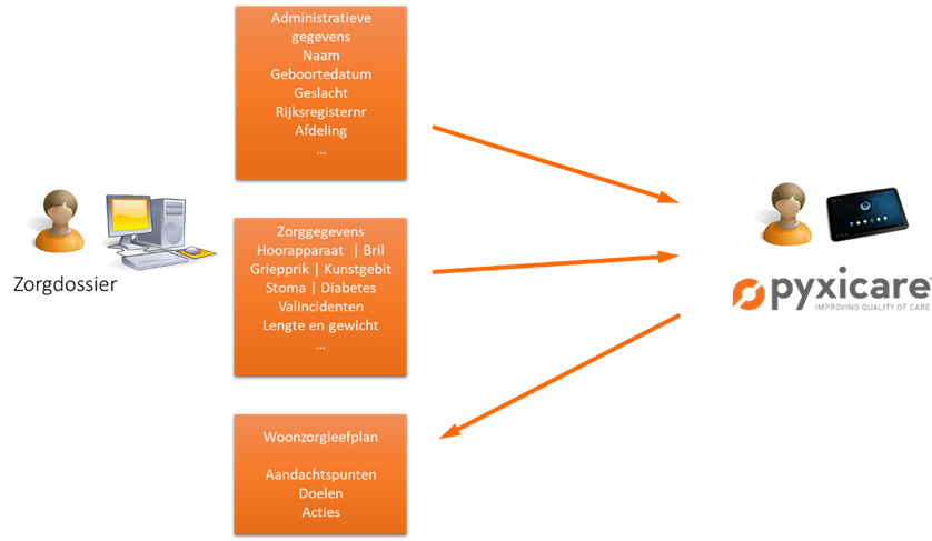 Pyxicare voorziet koppelingen met het zorgdossier op 3 niveaus: